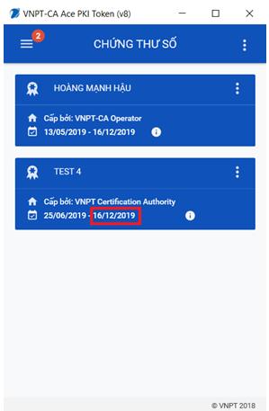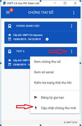 Sau khi các thủ tục gia hạn chữ ký số được hoàn tất giữa VNPT CA và khách hàng, yêu cầu gia hạn sẽ được duyệt trên hệ thống của VNPT CA, phần mềm sẽ hiển thị thông báo đã có chứng thư số mới trên hệ thống, khách hàng có thể cập nhật vào USB Token thông qua chức năng Cập nhật chứng thư mới.