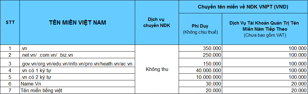 Bảng giá chuyển tên miền Việt Nam (.vn) về nhà đăng ký VNPT