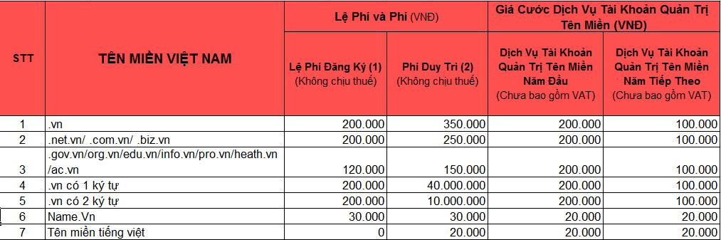 Bảng giá Đăng ký và duy trì Tên miền Việt Nam